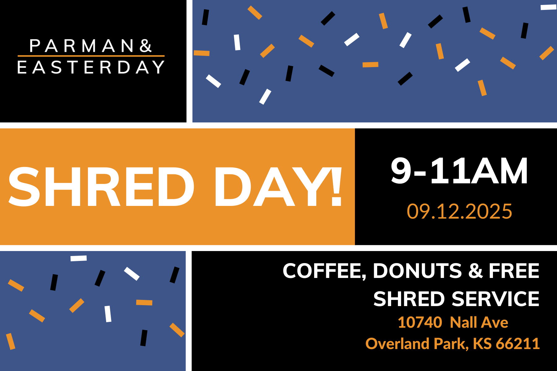 We will have two on-site mobile shred trucks. Staples and paper clips are fine, but please remove binder clips before shredding.
